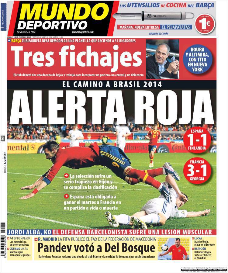 MUNDO DEPORTIVO SPAGNA – Dopo il pareggio di ieri contro la Finlandia la Spagna è costretta a vincere martedì contro la Francia.