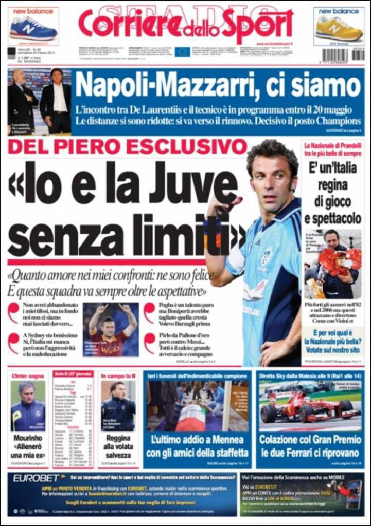 JUVENTUS DEL PIERO – Al Corriere dello Sport, Alessandro Del Piero parla in esclusiva della sua nuova vita australiana e della juventus: “Non avrei abbandonato i miei tifosi ma, in fondo, non noi ci siamo mai lasciati davvero. A Sydney sto benissimo. L’Italia mi manca, però, no l’aggressività e la maleducazione. Pogba è un talento puro ma Boniperti avrebbe tagliato quella cresta. Volevo Barzagli prima. Pirlo da Pallone d’Oro però contro Messi… Totti è il calcio, grande avversario e compagno“. Napoli-Mazzarri: ci siamo. L’incontro tra De Laurentiis e il tecnico è in programma entro il 20 maggio. Le distanze si sono ridotte: si va verso il rinnovo. Decisivo il posto Champions.