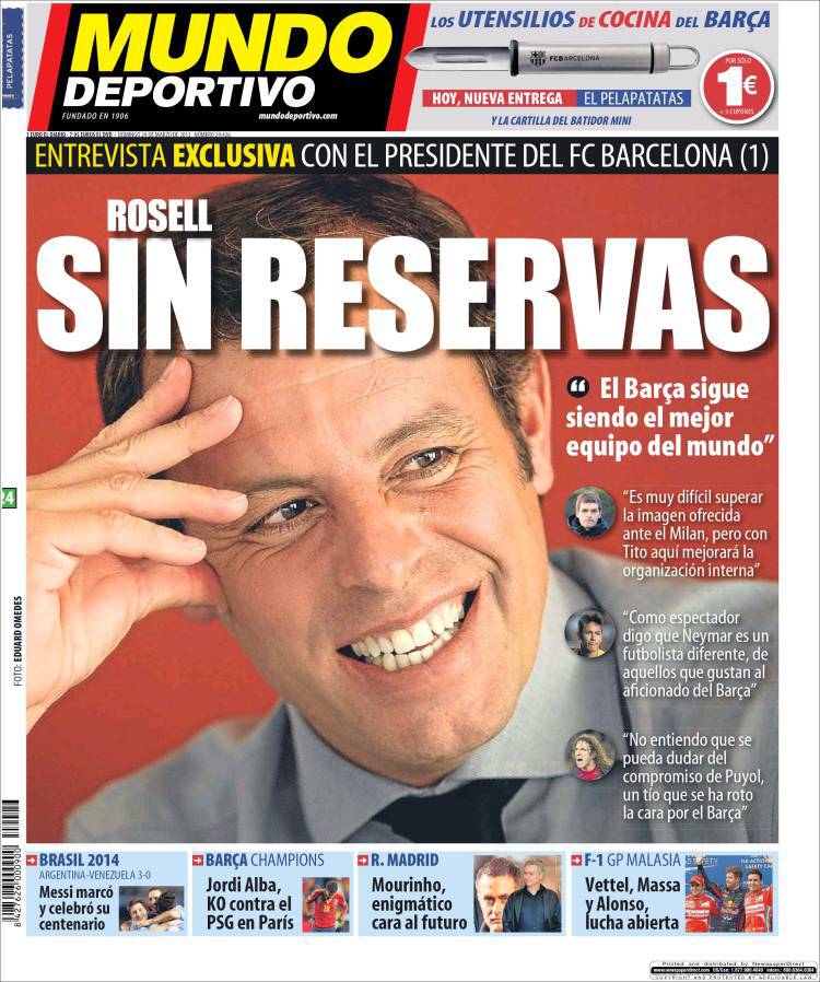 BARCELLONA ROSELL – Il presidente del Barcellona, Rosell, è senza riserva: “Restiamo la miglior squadra del mondo. E’ difficile superare l’immagine offerta contro il Milan però con il ritorno di Tito Vilanova possiamo migliorare l’organizzazione interna. Come spettatore dico che Neyman è un giocatore che fa la differenza, di quelli che il pubblico del Barcellona ama. Non si può mettere in dubbio l’impegno di Puyol, un ragazzo che ha dato tutto per il Barca”.