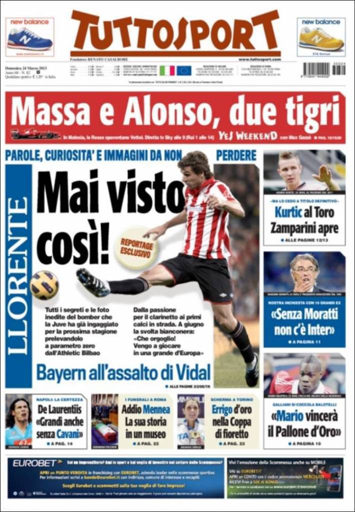 JUVENTUS LLORENTE – Tuttosport dedica l’edizione odierna a Fernando Llorente, nuovo bomber della Juventus che sbarcherà a Torino nella prossima sessione di mercato. Dalla passione per il clarinetto ai primi calci in strada. A giugno la svolta bianconera: “Che orgoglio! Vengo a giocare in una grande d’Europa”. De Laurentiis: “Napoli grande anche senza Cavani”.