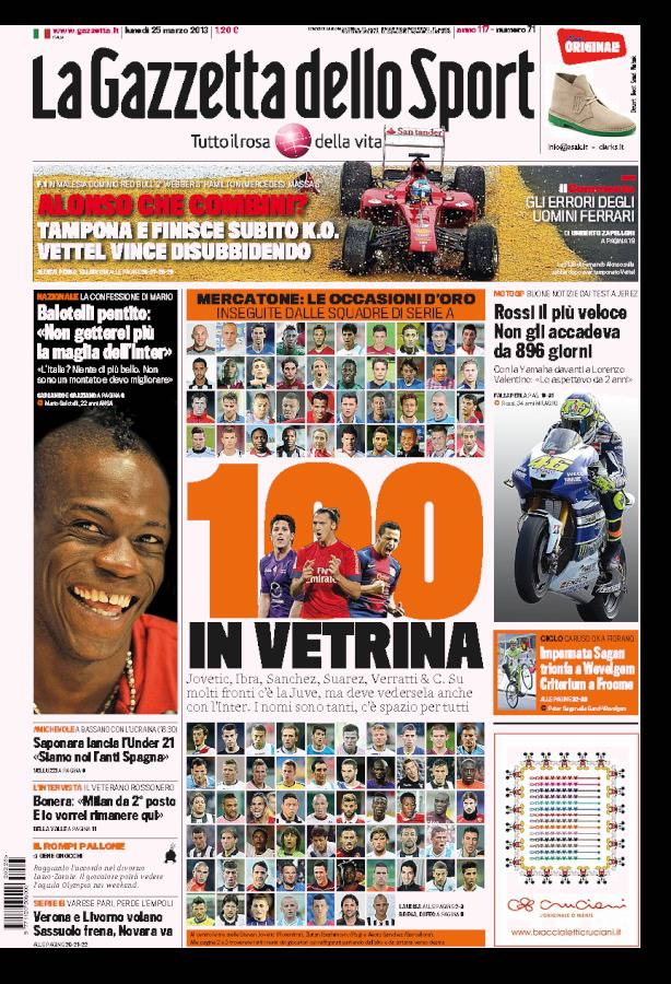 GAZZETTA GIOCATORI – Sulla Gazzetta dello Sport si parla di mercato con 100 giocatori pronti a cambiare squadra.