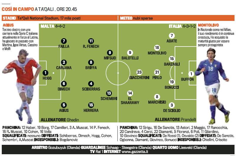 MALTA ITALIA PROBABILI FORMAZIONI – Poco più in basso troverete le probabili formazioni firmate Gazzetta dello Sport di Malta-Italia, gara che si giocherà questa sera alle ore 20.45 e che sarà valida per la qualificazione ai Mondiali in Brasile del 2014. Prandelli sceglie i blocchi di Juve e Milan, mandando in campo 6 bianconeri (Buffon, Barzagli, Bonucci, Pirlo, Marchisio e Giaccherini) e 5 rossoneri (Abate, De Sciglio, Montolivo, Balotelli ed El Shaarawy). Rispetto all’amichevole col Brasile qualche novità quindi, con la panchina per De Rossi, Maggio, ed Osvaldo.