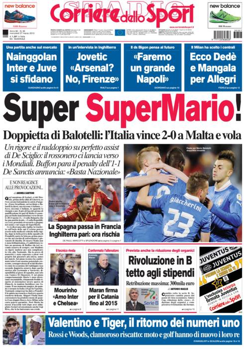 CORRIERE BALOTELLI – Sul Corriere dello Sport si parla di Balotelli che con la sua doppietta stende Malta.