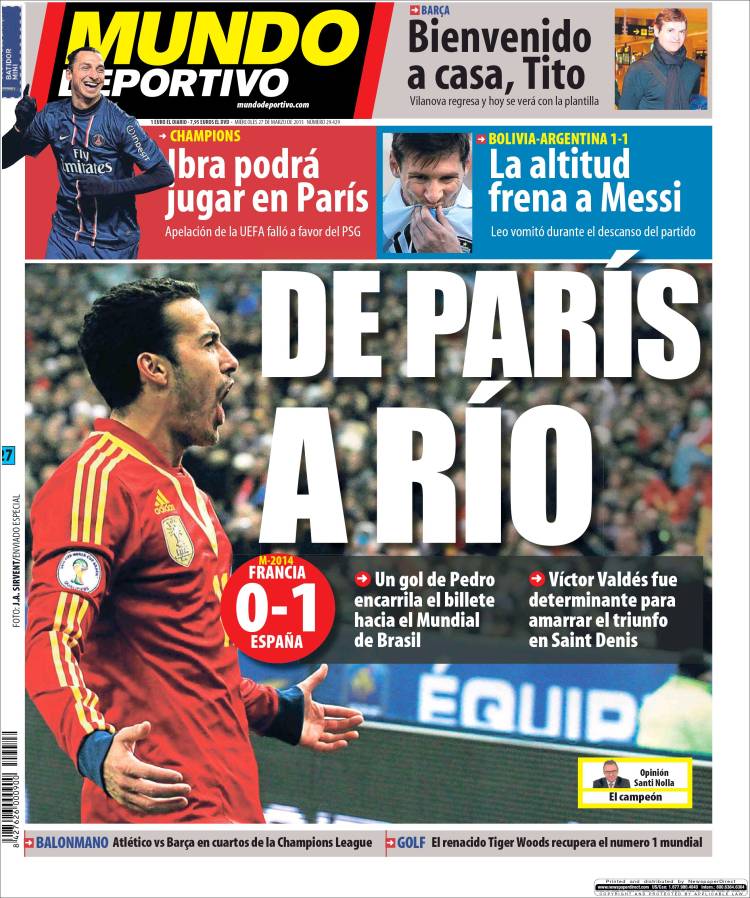 MUNDO DEPORTIVO SPAGNA – Sul quotidiano Mundo Deportivo si parla della Spagna che vince uno a zero in Francia grazie al gol di Pedro.