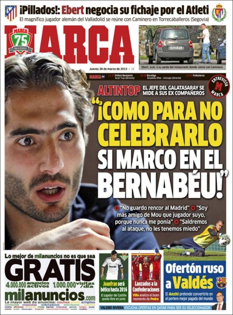 MARCA ALTINTOP – L’ex giocatore del Real Madrid Altintop, prossimo avversario dei madrileni con il Galatasaray, ha dichiarato che non esulterà in caso di gol al Real Madrid.