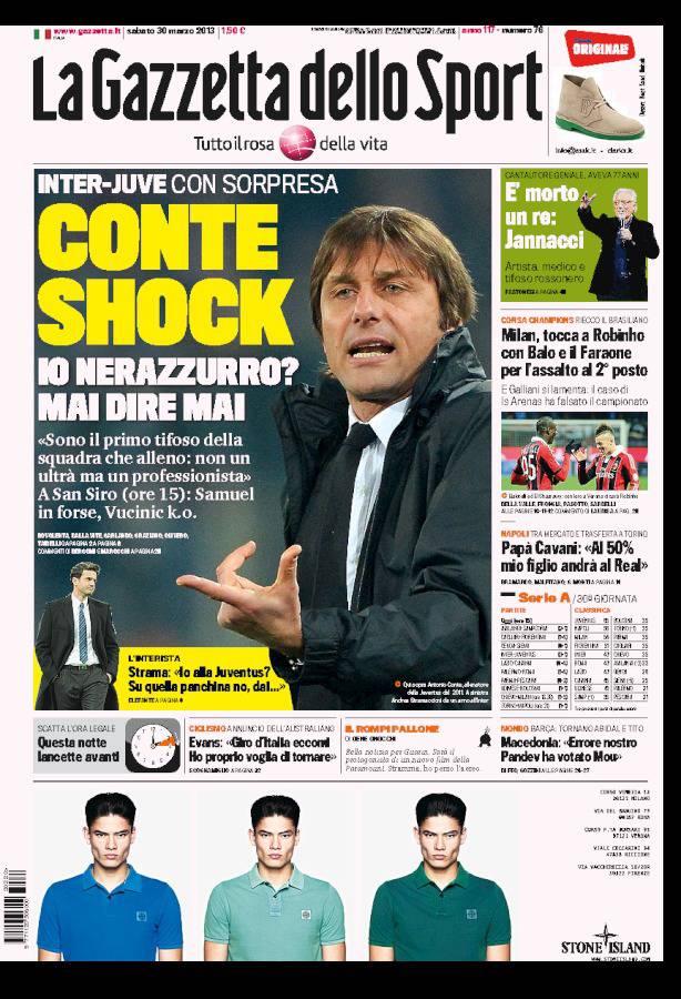 GAZZETTA CONTE – Sulla Gazzetta dello Sport si parla di Conte che ieri ha dichiarato che in futuro potrebbe diventare allenatore dell’Inter.