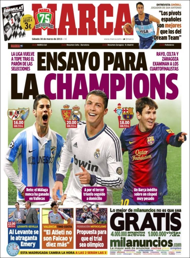 MARCA CHAMPIONS – Le tre squadre spagnole impegnate in Champions League, Malaga, Real Madrid, Barcellona, oggi giocheranno in campionato.