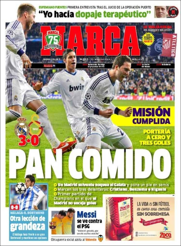 Marca: Un pezzo è mangiato 04/04/2013 di Admin3 MARCA REAL MADRID – Sul quotidiano Marca si usa la metafora del pane mangiato per celebrare il tre a zero del Real Madrid sul Galatasaray nell’andata dei quarti di finale. La redazione di Calciomercatonews.com