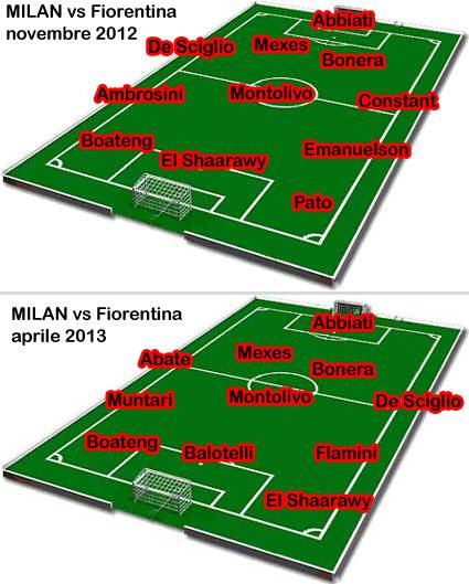 FOTO MILAN FIORENTINA – E’ passato un girone esatto dalla sonante sconfitta subita dal Milan in casa contro la Fiorentina. Allora la squadra rossonera non aveva ancora una forma ed un modulo ben preciso, adesso invece il team di Allegri è senza dubbio il migliore visto nel girone di ritorno di tutta la Serie A. In una interessante grafica vi proponiamo quella che è la trasformazione radicale che Massimiliano Allegri ha apportato nei suoi 11 un girone dopo. La formazione è senza dubbio rivoluzionata nel centrocampo e nell’attacco, veri punti di forza di queste ultime settimane milaniste.