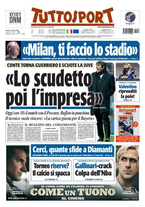TUTTOSPORT SCUDETTO – Su Tuttosport si parla di Conte che pensa allo Scudetto e poi a fare l’impresa contro il Bayern Monaco.
