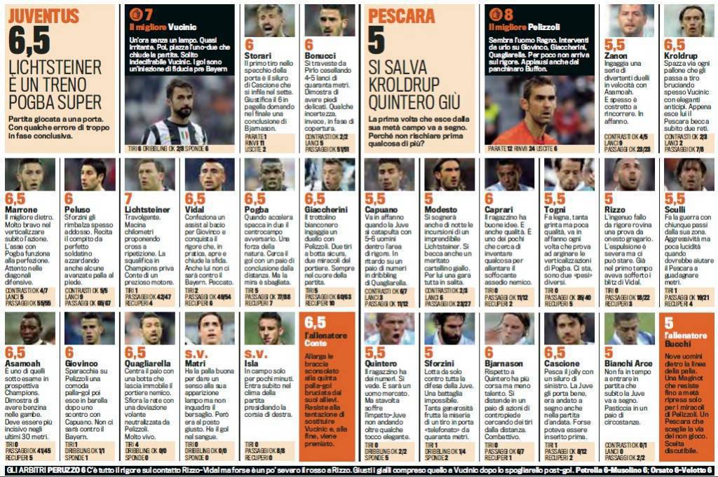 JUVENTUS PESCARA VOTI E PAGELLE GAZZETTA DELLO SPORT – Di seguito potete trovare i voti e le pagelle Gazzetta dello Sport di Juventus-Pescara, gara giocatasi ieri sera alle ore 18.00 allo Juventus Stadium e conclusasi con il risultato di 2 a 1 per i bianconeri grazie alla doppietta di Vucinic. E proprio il montenegrino alla fine è il migliore in campo. Una prova indecifrabile quella dell’ex Roma, che non si fa vedere per un’ora per poi esplodere. Molto bene anche Lichtsteiner, decisamente travolgente sulla corsia di destra. In casa Pescara super prova di Pellizzoli, voto 8 per lui.
