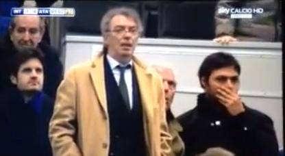 Dalla tribuna il presidente nerazzurro Massimo Moratti appare incredulo di fronte all’errore del suo giocatore.