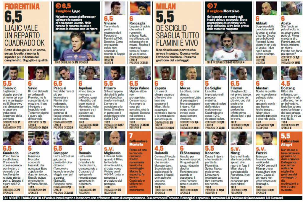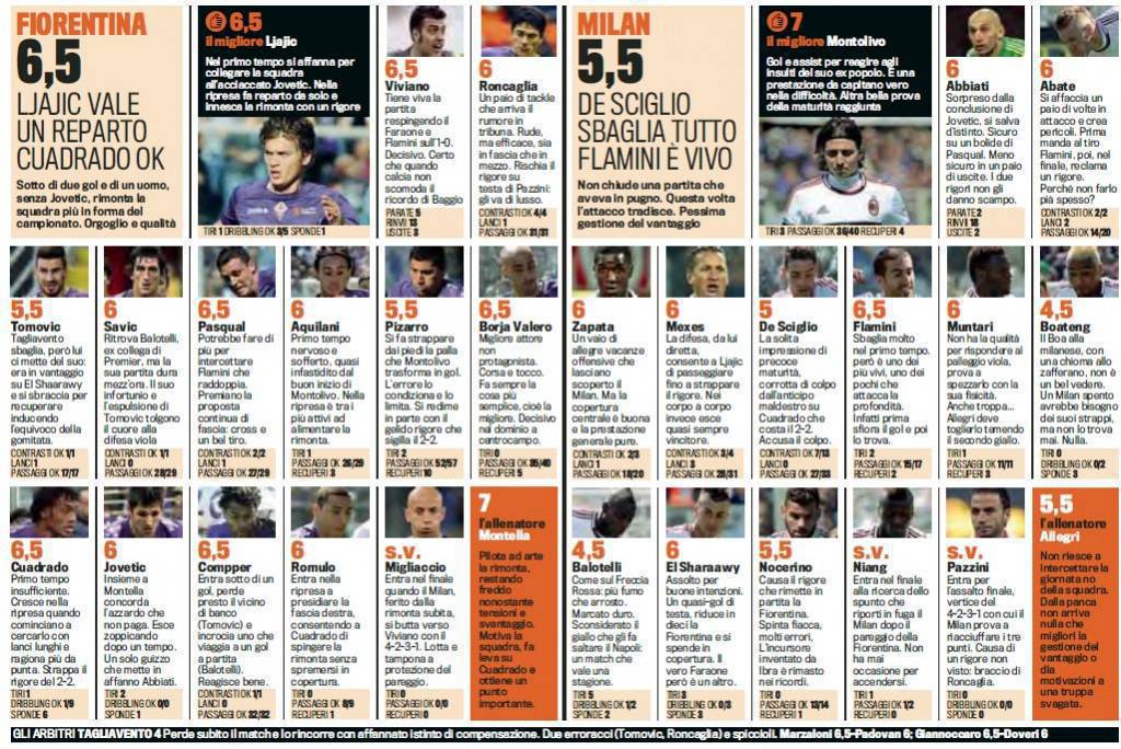 FIORENTINA MILAN VOTI PAGELLE GAZZETTA SPORT – Poco più in basso troverete i voti e le pagelle firmate Gazzetta dello Sport di Fiorentina-Milan, sfida giocatasi ieri mezzogiorno al Franchi e conclusasi con il risultato di parità, 2 a 2. Migliore in assoluto della gara è risultato alla fine Riccardo Montolivo (voto 7 per lui) che in un clima incandescente ha segnato e regalato un assist. Male invece Boateng e Balotelli. Malissimo infine Tagliavento, bocciato dalla Rosa con un 4 dopo i continui errori del secondo tempo.