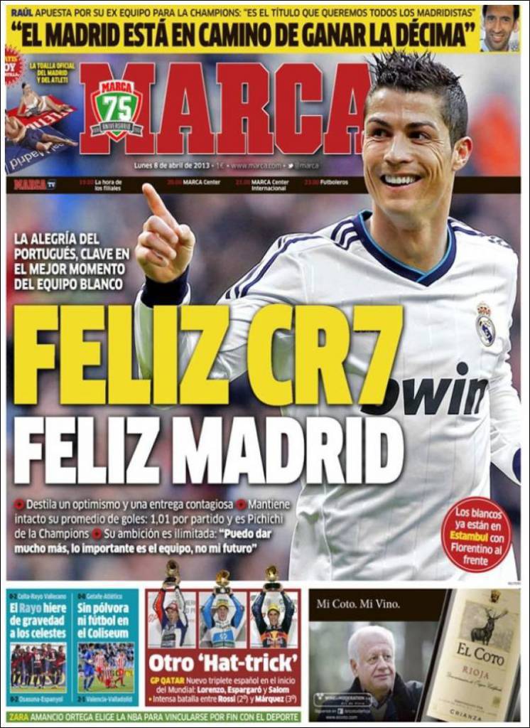 MARCA CR7 REAL MADRID – Sul quotidiano Marca sono sicuri che la felicità di Ronaldo ha portato il Real Madrid a fare grandi risultati.