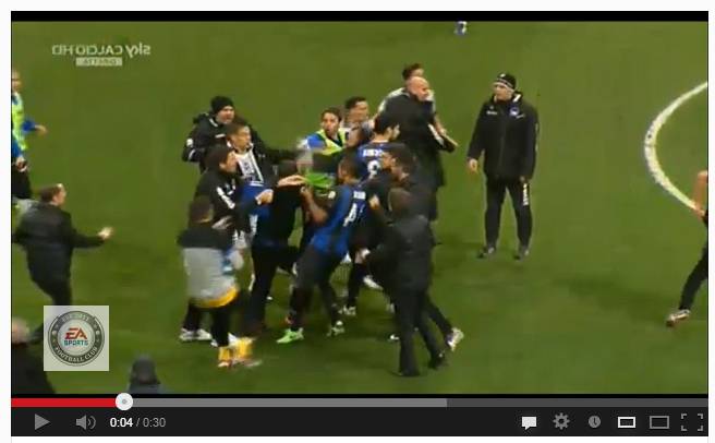 VIDEO RISSA INTER ATALANTA – Si è conclusa nel peggiore dei modi la sfida fra l’Inter e l’Atalanta, giocatasi ieri sera allo stadio San Siro e terminata con il risultato di 4 a 3 per i bergamaschi. Al fischio finale si è scatenata una rissa in mezzo al campo con protagonista Ezequiel Schelotto, il grande ex di turno, infuriato (pare) per alcuni insulti ricevuti da un massaggiatore o da un “tecnico” dell’Atalanta. Anche l’allenatore della Dea, Colantuono, si è messo di mezzo per cercare di placare gli animi e alla fine il tutto si è risolto fortunatamente.