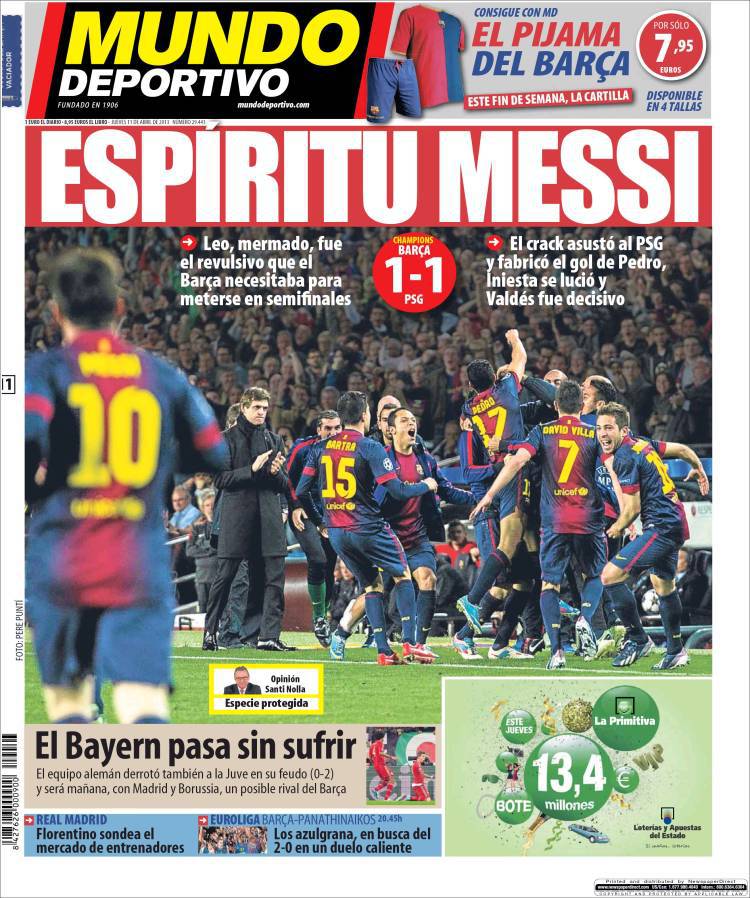 MUNDO DEPORTIVO MESSI – Sul quotidiano Mundo Deportivo si parla del Barcellona che pareggiando uno a uno contro il Psg vola in semifinale.