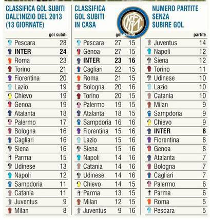 INTER PESCARA DIFESA 2013 – E’ vero, in alcune circostanze gli arbitri hanno sfavorito l’Inter, ma alcuni dati statistici dimostrano che la difesa nerazzurra è davvero tra le peggiori del campionato. Numeri pazzeschi per la retroguardia nerazzurra che nel 2013 ha incassato 24 reti, peggio ha fatto solo il Pescara con 28 gol subiti. Numeri che dovranno far riflettere sicuramente il tecnico dell’Inter Stramaccioni, basti pensare che il Milan ne ha subiti 8 e la Juventus 9. Non solo, in casa l’Inter ha subito 23 gol in 16 partite, rimanendo senza subire gol solo in otto partite. Numeri su cui riflettere quelli postati da Tuttosport.