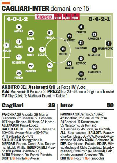CAGLIARI INTER ROCCHI PINILLA SILVESTRE FORMAZIONI – Domani pomeriggio l’Inter giocherà contro il Cagliari a Trieste dove cercherà assolutamente di raccogliere tre punti per dimenticare la brutta sconfitta casalinga contro l’Atalanta. Il tecnico Stramaccioni, secondo la Gazzetta dello Sport, ha deciso di riproporre la difesa a tre con Silvestre centrale al posto di Samuel. A centrocampo conferma per l’ottimo Kovacic, in attacco Alvarez e Guarin dietro a Tommaso Rocchi, unica punta a disposizione. Nel Cagliari invece Cossu trequartista dietro a Pinilla e Sau. Ecco le probabili formazioni secondo la Gazzetta dello Sport.