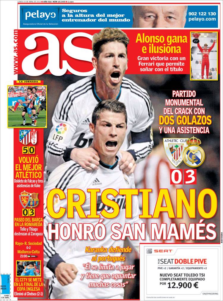 AS RONALDO – Nello stadio dell’Athletic Bilbao, Ronaldo segna una doppietta nel tre a zero del Real Madrid.