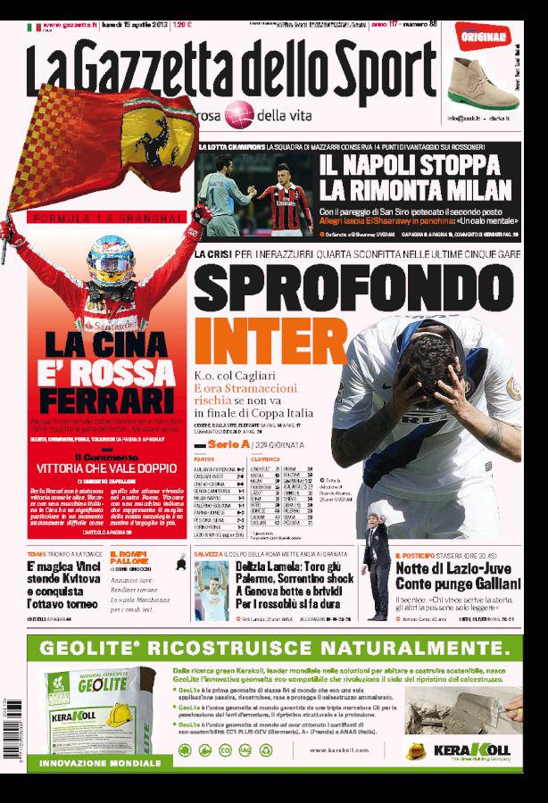 GAZZETTA INTER – Ennesima sconfitta per l’Inter che ieri ha perso due a zero contro il Cagliari.