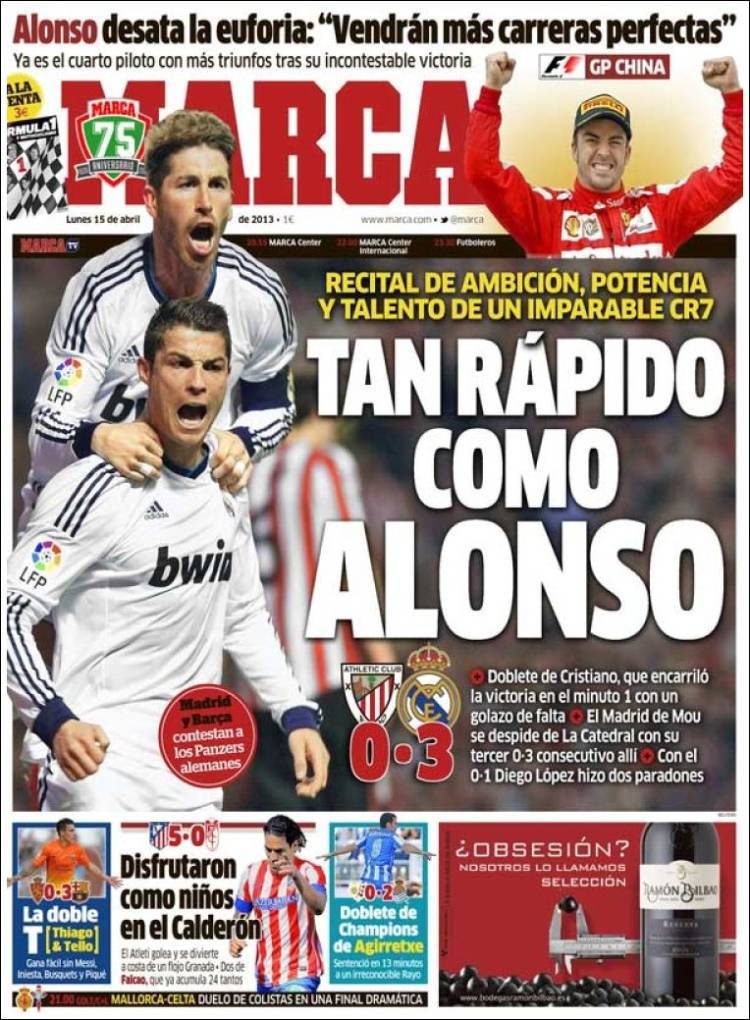 MARCA RONALDO ALONSO – Giornata perfetta per gli spagnoli che esultano per la vittoria di Alonso nel Gran Premio di Shanghai ed esultano per la doppietta di Ronaldo nel tre a zero del Real Madrid.