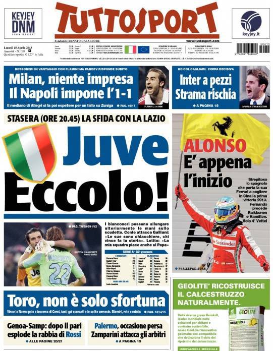 TUTTOSPORT JUVENTUS – Su Tuttosport si parla della Juventus che questa sera giocherà contro la Lazio. In caso di vittoria allungherebbe il passo in testa.