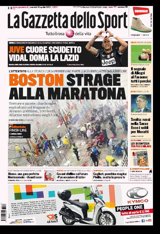 GAZZETTA DELLO SPORT BOSTON – Il titolo della Gazzetta dello Sport di stamani si concentra sulla strage accaduta nella serata italiana a Boston: 3 bombe sono esplose all’arrivo della maratona di Boston. E’ allarme terrorismo…