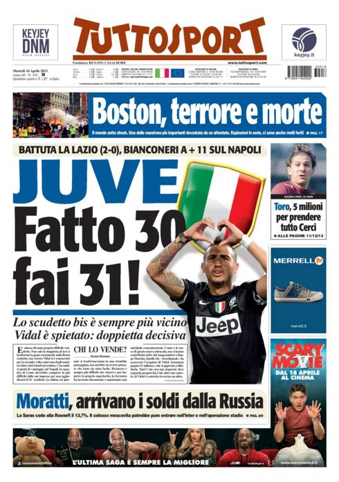 TUTTOSPORT JUVENTUS 30 31 – Il quotidiano torinese Tuttosport, stamani in edicola, ha invitato la Juventus a collezionare il suo 31 esimo scudetto. La vittoria per 0-2 sulla Lazio è ormai più di una sicurezza per il secondo trionfo consecutivo.