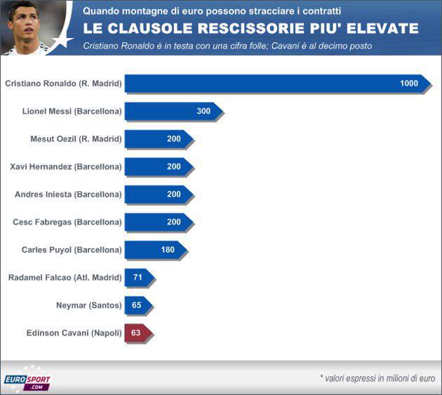 CALCIOMERCATO CLAUSOLE RESCISSORIE CRISTIANO RONALDO 1000 MILIONI DI EURO – Quanto sono importanti le clausole rescissorie inserite nei contratti del calciatori? Il Napoli lo sa bene: in estate ha ceduto per 31 milioni di euro Lavezzi e si appresta a cedere per quasi 70 milioni di euro Edinson Cavani in estate. Uno studio di Eurosport.com ha messo a confronto tutte le più alte clausole rescissorie al momento presente nel calcio. A stravincere è Cristiano Ronaldo, per cui, chi vuole prelevarlo, deve sborsare la bellezza di 1000 milioni di euro. Molto distaccato Messi: per lui ne bastano “solo” 300 di milioni.