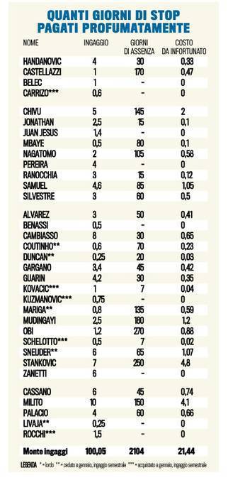 FOTO INTER SOLDI SPRECATI INFORTUNI – Stagione nera, nerissima per l’Inter. L’uscita dalla Coppa Italia in semifinale, l’uscita prematura dall’Europa League ed infine un piazzamento in campionato tutt’altro che edificante. Andrea Stramaccioni può senza dubbio recriminare per un paio di decisioni arbitrali abbastanza discutibili, ma soprattutto per i numerosissimi infortuni che hanno segnato oltremodo la stagione nerazzurra. Una interessante grafica di TuttoSport, mette insieme i giorni di infortuni dei calciatori nerazzurri, accanto al costo da infortunato di ogni giocatore ed al suo relativo ingaggio. Il risultato ottenuto è devastante per le casse nerazzurre: 21,44 milioni di euro sprecati.