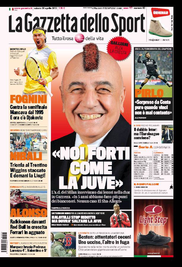 GAZZETTA JUVENTUS – Sulla Gazzetta dello Sport Adriano Galliani, amministratore delegato del Milan, gonfia il petto e sfida la Juventus.