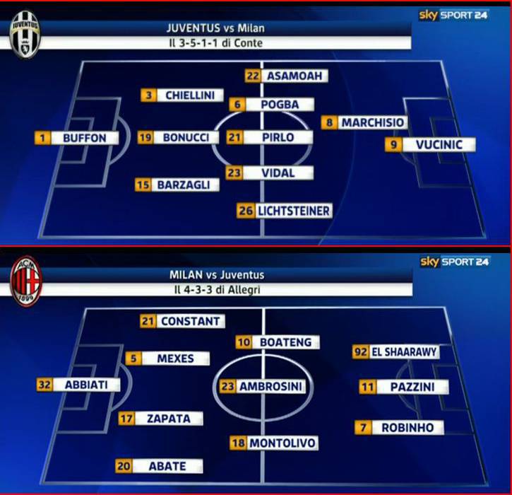 JUVENTUS MILAN FORMAZIONE CHIELLINI – Dalla redazione di Sky Sport 24 arrivano le ultime novità di formazione per la sfida di questa sera tra Juventus e Milan. Piovono conferme su quelle che erano le formazioni date alla vigilia: la Juventus infatti varerà il nuovo 3-5-1-1 con Marchisio alle spalle di Vucinic. Ritorna in campo dal primo minuto Giorgio Chiellini, difensore che ritorna in campo dopo l’ennesimo infortunio della sua stagione. Tridente spregiudicato invece per Allegri: Robinho, Pazzini ed El Shaarawy sono pronti a dare battaglia alla squadra allenata da Antonio Conte.