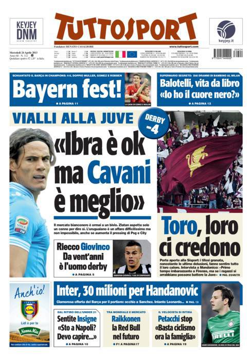 TUTTOSPORT CAVANI – Su Tuttosport parla Vialli che non boccia Ibrahimovic ma preferirebbe l’uruguagio del Napoli.
