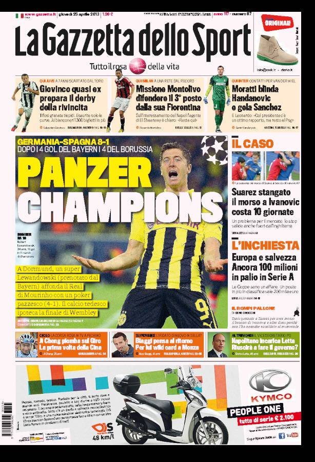 GAZZETTA CHAMPIONS – Sulla Gazzetta dello Sport si parla del Borussia Dortmund che vince quattro a uno contro il Real Madrid, quattro gol di bomber Lewandowski.