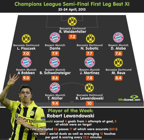 BEST 11 SEMIFINALI ANDATA – Il sito Whoscored.com, noto e specializzato in statistiche legate al mondo del calcio, ha pubblicato il best 11 dell’andata delle semifinali di Champions League. Una squadra naturalmente composta da soli giocatori del Bayern e del Borussia, che hanno letteralmente asfaltato Barcellona e Real Madrid. 5 i calciatori gialloneri e precisamente il portiere Weidenfeller, il terzino destro Piszczek, il centrale Subotic, il centrocampista Reus e naturalmente Lewandowski (il migliore in assoluto della due giorni Champions). Per il Bayern, invece, presenti Dante, Alaba, Martinez, Schweinsteiger e Muller.