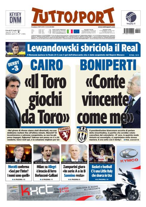 TUTTOSPORT TORINO JUVENTUS – Meno tre giorni al derby di Torino tra Juventus e Torino. Parlano Cairo e Boniperti.