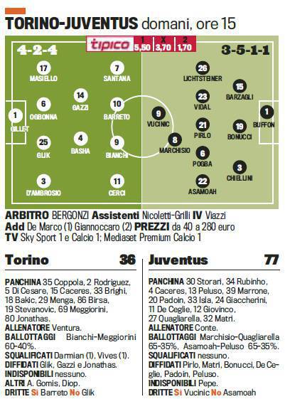 TORINO JUVENTUS VENTURA PROBABILI FORMAZIONI – Domenica sera la Juventus scenderà in campo contro il Torino nel derby della Mole. I granata cercano un successo lontano ormai 15 anni, la Juventus conoscerà già il risultato del Napoli e potrebbe clamorosamente festeggiare lo Scudetto in casa del Torino. Ventura proporrà una squadra a trazione anteriore, un 4-2-4 con Cerci e Santana larghi. Nella Juventus confermato il 4-4-1-1 con Marchisio dietro Vucinic. A centrocampo confermato anche Pogba con Vidal. Il Torino con una vittoria sarebbe salvo. Probabili formazioni secondo la Gazzetta dello Sport.