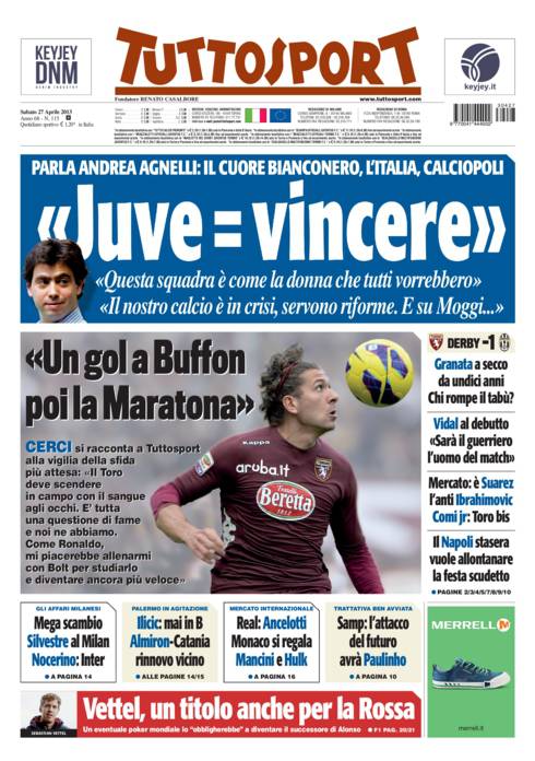 TUTTOSPORT JUVENTUS – Su Tuttosport parla Agnelli che vuole vincere il derby e polemizza sul calcio italiano.