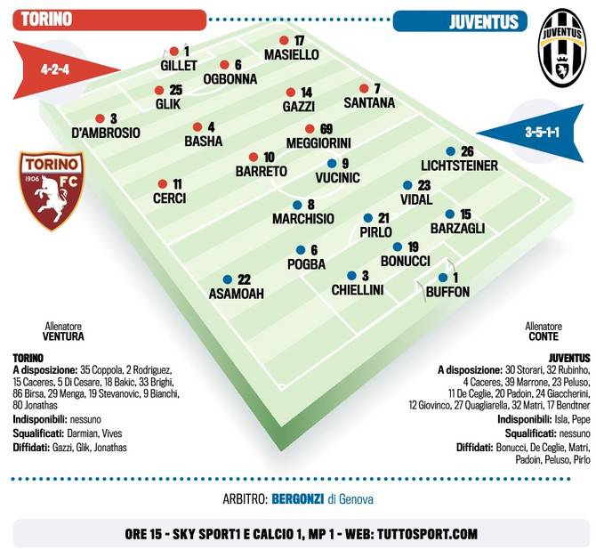 TORINO JUVENTUS PROBABILI FORMAZIONI CONTE 3-5-1-1 – Nonostante non andrà a decidere lo scudetto della Juventus, Torino-Juventus sarà senza dubbio un derby importante ed interessante tra due squadre che interpretano in maniera essenzialmente differente il gioco del calcio. Da una parte il 4-2-4 di Ventura, dall’altra il 3-5-1-1 di Conte. TuttoSport ha preparato un’interessante grafica che mette faccia a faccia le due squadre: da una parte il Toro con la coppia Barreto Meggiorini avanti, dall’altra la Juve con Marchisio ancora una volta alle spalle di Vucinic.