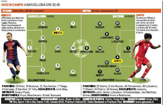 BARCELLONA BAYERN MONACO PROBABILI FORMAZIONI VILLA MANDZUKIC – L’eliminazione del Real Madrid fa male alla Spagna che adesso spera nel miracolo sportivo del Barcellona che al Camp Nou dovrà recuperare ben quattro gol di svantaggio da un Bayern Monaco in grandissima forma. Vilanova punta tutto sul trio d’attacco con Villa preferito a Sanchez, Messi e Pedro completeranno le frecce di Vilanova. In difesa Adriano prenderà il posto dello squalificato Jordi Alba. Nel Bayern Monaco invece Mandzukic preferito a Mario Gomez per le sue doti di contropiedista. Probabili formazioni secondo la Gazzetta dello Sport.
