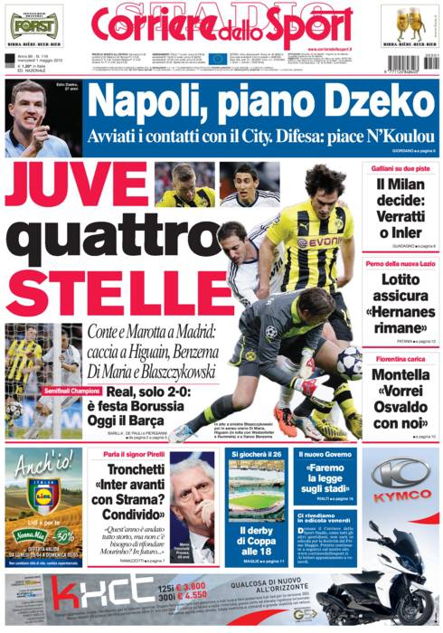 Corriere dello Sport: Juve quattro stelle 01/05/2013 di Admin3 CORRIERE CONTE – Ieri Conte e Paratici a Madrid per assistere al match tra Real e Borussia e prendere appunti su quattro giocatori. La redazione di Calciomercatonews.com