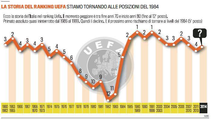 RANKING UEFA ITALIA PORTOGALLO – Continua il momento negativo dell’Italia per quanto concerne il Ranking Uefa. L’Italia infatti rischia di scivolare al quinto posto dietro il Portogallo visto che i lusitani al momento sono a cinque punti ma se il Benfica riuscisse a vincere contro il Fenerbahce e approdare in finale di Europa League allora il distacco sarebbe di millesimi con il rischio che nella prossima stagione ci potrebbe essere il sorpasso visto che tutte le società portoghesi prendono seriamente la seconda manifestazione europea. Insomma non si mette affatto bene per le italiane.
