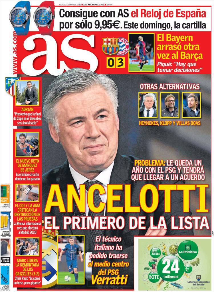 AS ANCELOTTI – Sul quotidiano As si parla di Ancelotti come primo obiettivo per la panchina del Real Madrid.