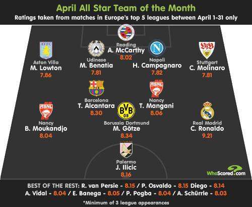 BEST 11 APRILE – Il noto sito di statistiche sul calcio Whoscored.com, ha stilato il best 11 del mese di aprile da poco conclusosi. Nell’11 davvero interessante figurano tre calciatori che militano in Serie A, e precisamente Campagnaro del Napoli, Benatia dell’Udinese e Ilicic del Palermo, nonché l’italiano Molinaro, terzino sinistro dello Stoccarda. Fra le stelle presenti figurano Goetze, Ronaldo e Thiago Alcantara. In “panchina”, infine, figurano Pogba e Vidal, entrambi protagonisti assoluti con la casacca bianconera durante lo scorso mese.