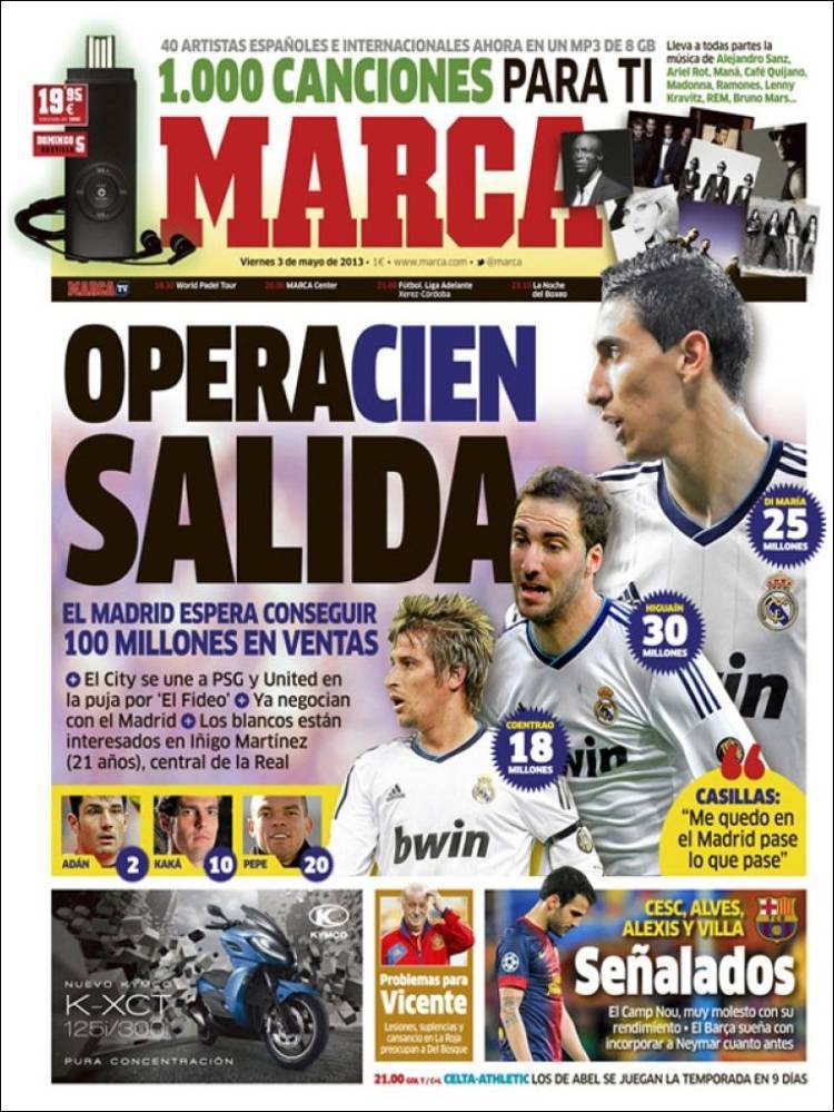 MARCA REAL MADRID – Il Real Madrid spera di ottenere 100 milioni di euro dalle cessioni di Higuain, Di Maria, Fabio Coentrao e altri giocatori.