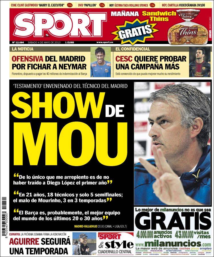 SPORT MOURINHO – Sul quotidiano Sport si parla di Mourinho che attacca il Real Madrid. Con lui tre semifinali di Champions League in tre anni.