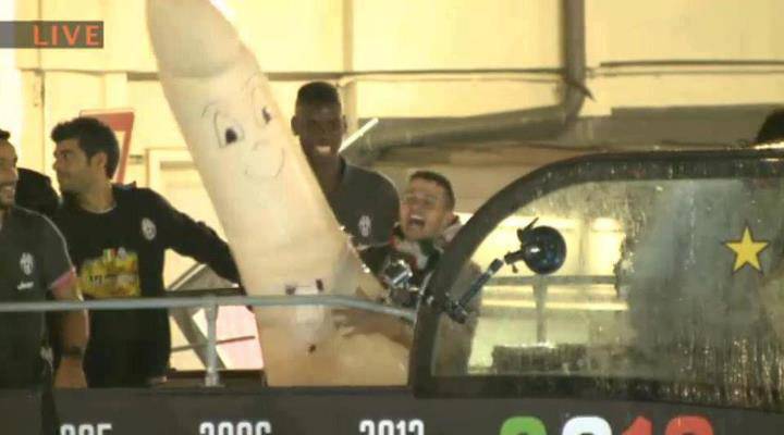 FOTO TROPPA EUFORIA AUTOBUS JUVENTUS GIOVINCO – Scene davvero incredibili quelle accadute sull’autobus che portava in giro i calciatori della Juventus per la festa scudetto. Oltre alle normali scene di entusiasmo, a volte è sembrato davvero di esagerare. E’ apparsa stamani su internet una foto che ritrae Sebastian Giovinco, attaccante bianconero, con un enorme fallo di gomma sorridente, mimando gesti abbastanza inconsueti. Giovinco appareva anche molto divertito da questo scherzone, come Paul Pogba, al suo fianco. A volte l’euforia è davvero troppa…