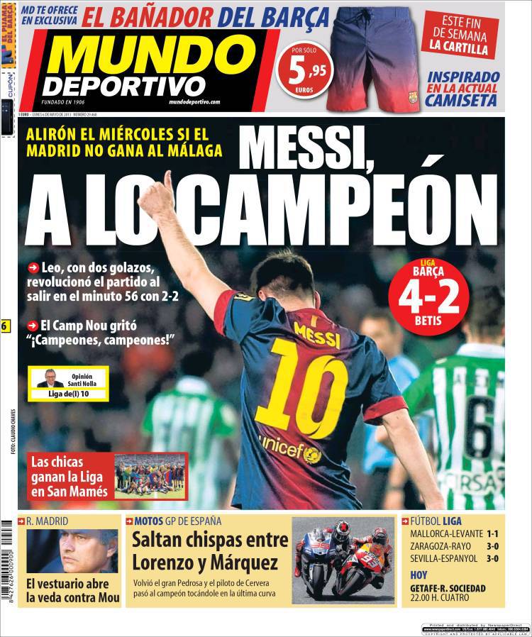 MUNDO DEPORTIVO MESSI – Sul quotidiano Mundo Deportivo si parla di Messi che con la sua doppietta ha avvicinato il Barcellona alla vittoria della Liga.