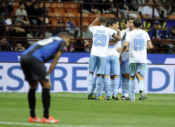 CALCIO INTER LAZIO – L’Inter aveva bisogno dei tre punti per proseguire la corsa verso l’Europa, lo stesso valeva però anche per la Lazio e alla fine sono stati proprio i capitolini a spuntarla. Netto il risultato finale, già la prim frazione di gioco si chiude con i biancocelesti in vantaggio. Dopo 22 minuti Handanovic sbaglia completamente l’uscita e mette in rete il cross di Candreva, è proprio l’ex juventino a fallire il raddoppio appena un minuto dopo. Al minuto 34 Alvarez rimette in piedi la gara con un colpo di testa, ma in pieno recupero Ranocchia fa fallo da rigore su Floccari. Hernanes trasforma e si va negli spogliatoi. Guarin manca clamorosamente il gol del pari, stessa cosa fa Alvarez che si becca bordate di fischi da parte dei suoi testi tifosi quando fallisce in maniera a dir poco goffa il penalty concesso per il tocco di mano di Cana. Al 77esimo il sigillo finale lo mette Onazi con un tiro incredibile dalla distanza che va a finire all’incrocio dei pali. Forcing dei padroni di casa negli ultimi minuti ma Marchetti a bravo a respingere tutti gli assalti. Finisce 1-3, tra errori clamorosi e infortuni (altri due questa sera), fotografia perfetta della disgraziata annata nerazzurra. A complicare tutto ci si mette la vittoria della Fiorentina sul campo del Siena. La Juventus, già campiona d’Italia, sconfigge l’Atalanta con un gol di Matri. Il Napoli ne fa tre a casa del Bologna. Il Parma cade a Cagliari, pareggiano Torino e Genoa, così come Sampdoria e Catania. Bel successo dell’Udinese a Palermo.