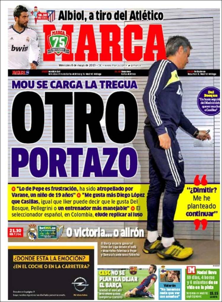 MARCA MOURINHO – Sul quotidiano Marca si parla di Mourinho che ieri ha attacco tutti i giocatori che hanno remato contro di lui nel Real Madrid.
